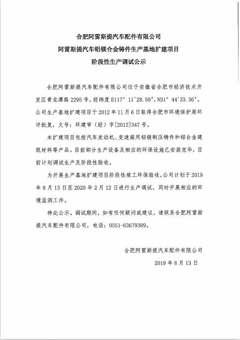 合肥阿雷斯提汽車配件有限公司阿雷斯提汽車鋁鎂合金鑄件生產基地擴建項目階段性生產調試公示